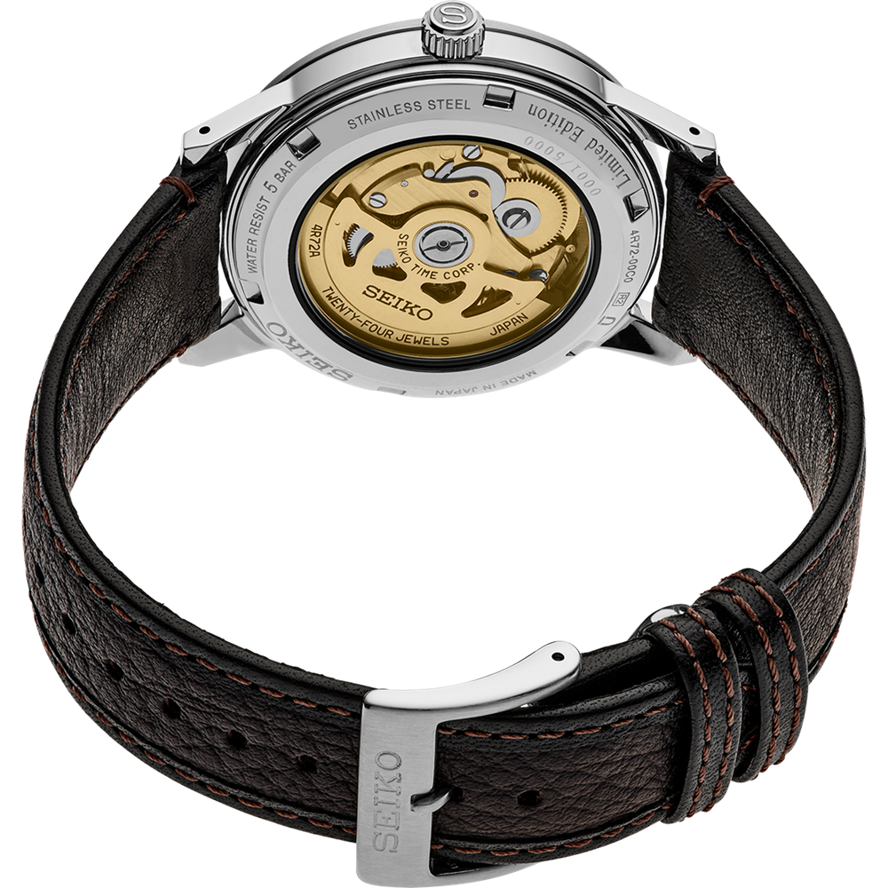 The Seiko SSA461J1 is finished with a tang pin buckle leather strap, matching hands and indexes and box-shape hardlex glass . Water resistance rating is 50m and additional features include a screw case back, exhibition case back and a cut out movement.